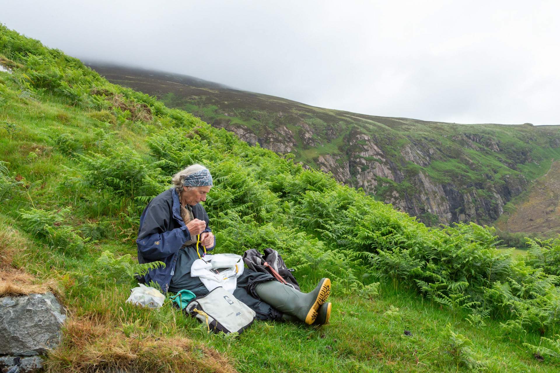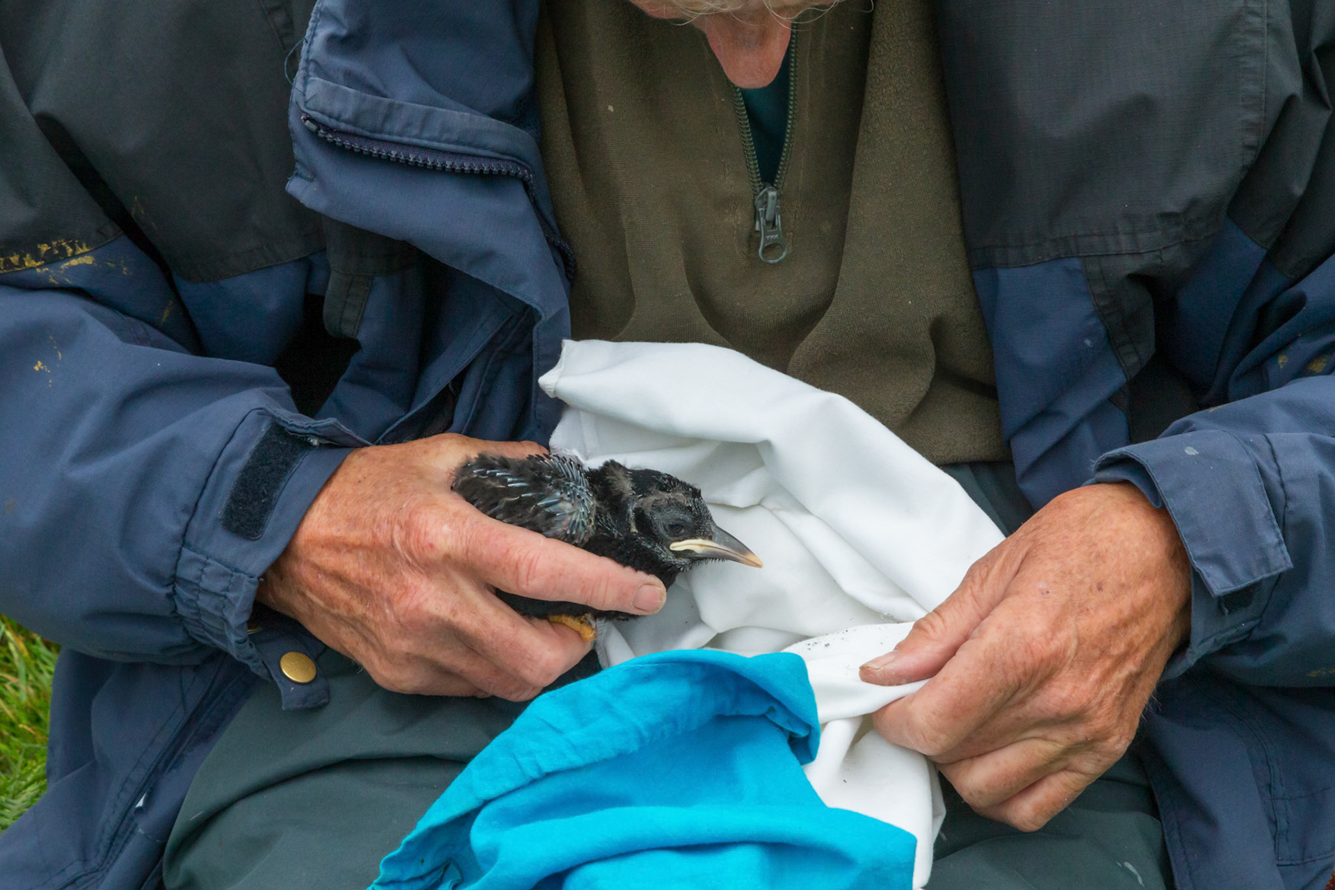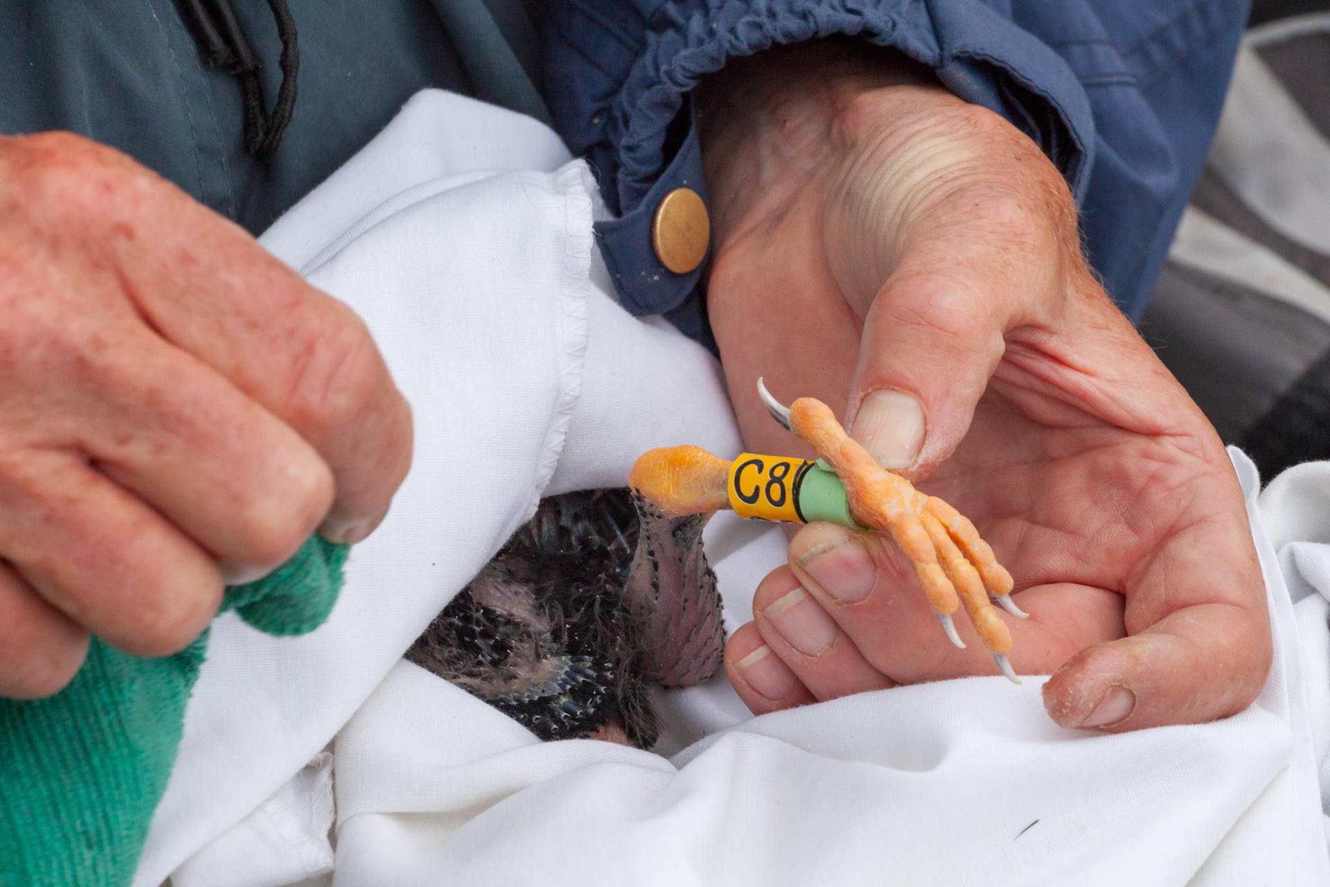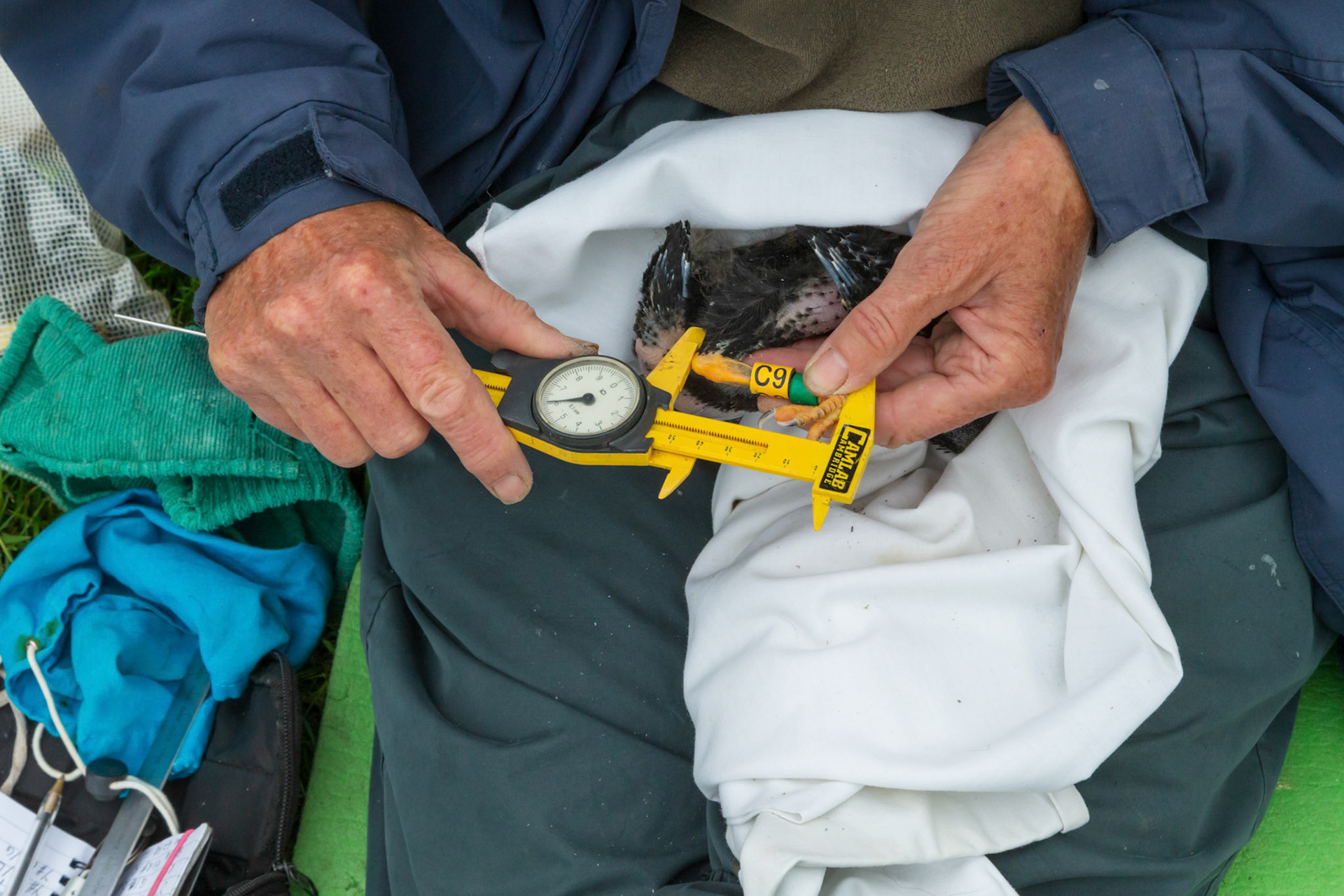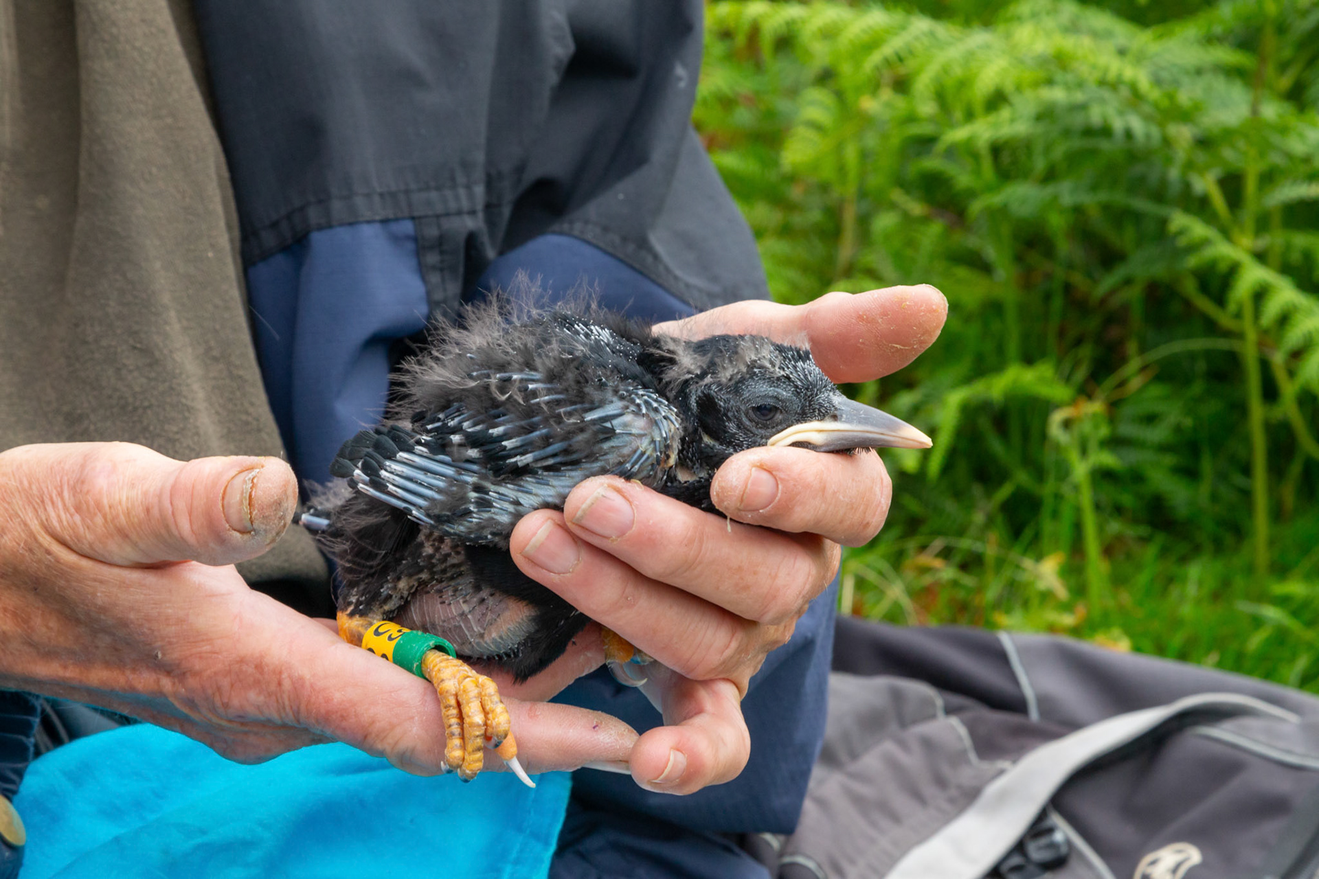 Chough, Pyrrhocorax pyrrhocorax, with rings, feeding on cliff. Summer, South Stack, Anglesey, Wales, UK