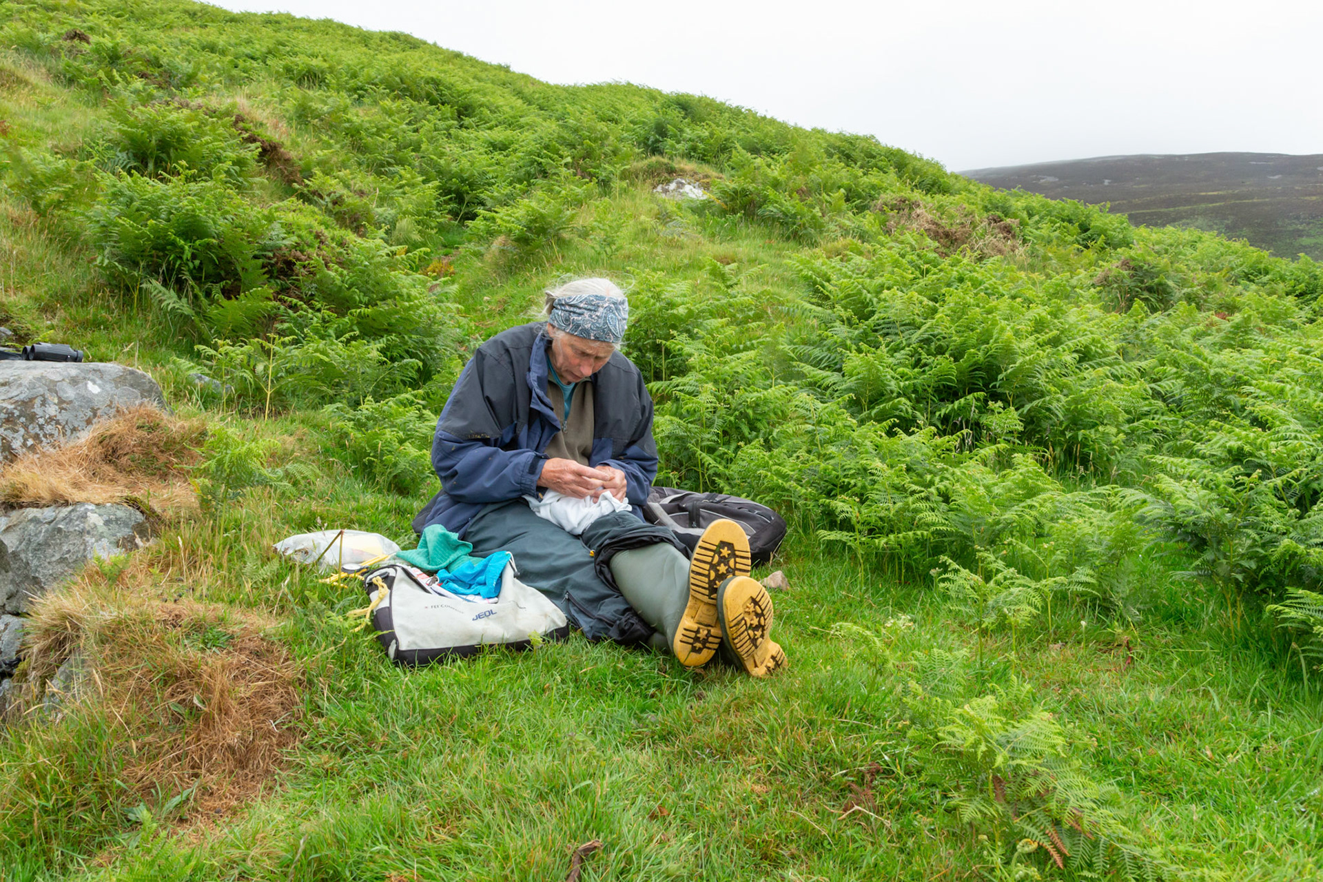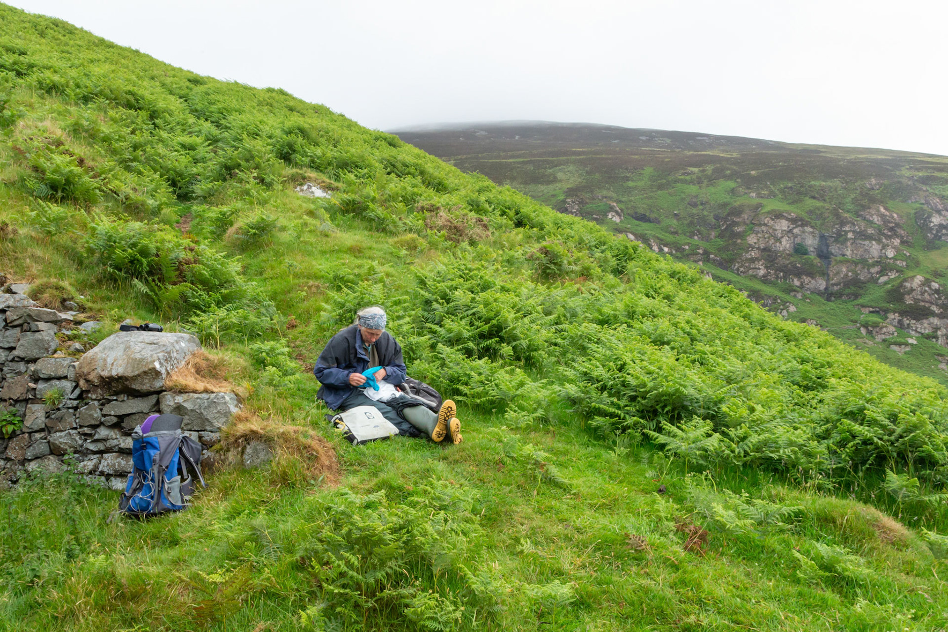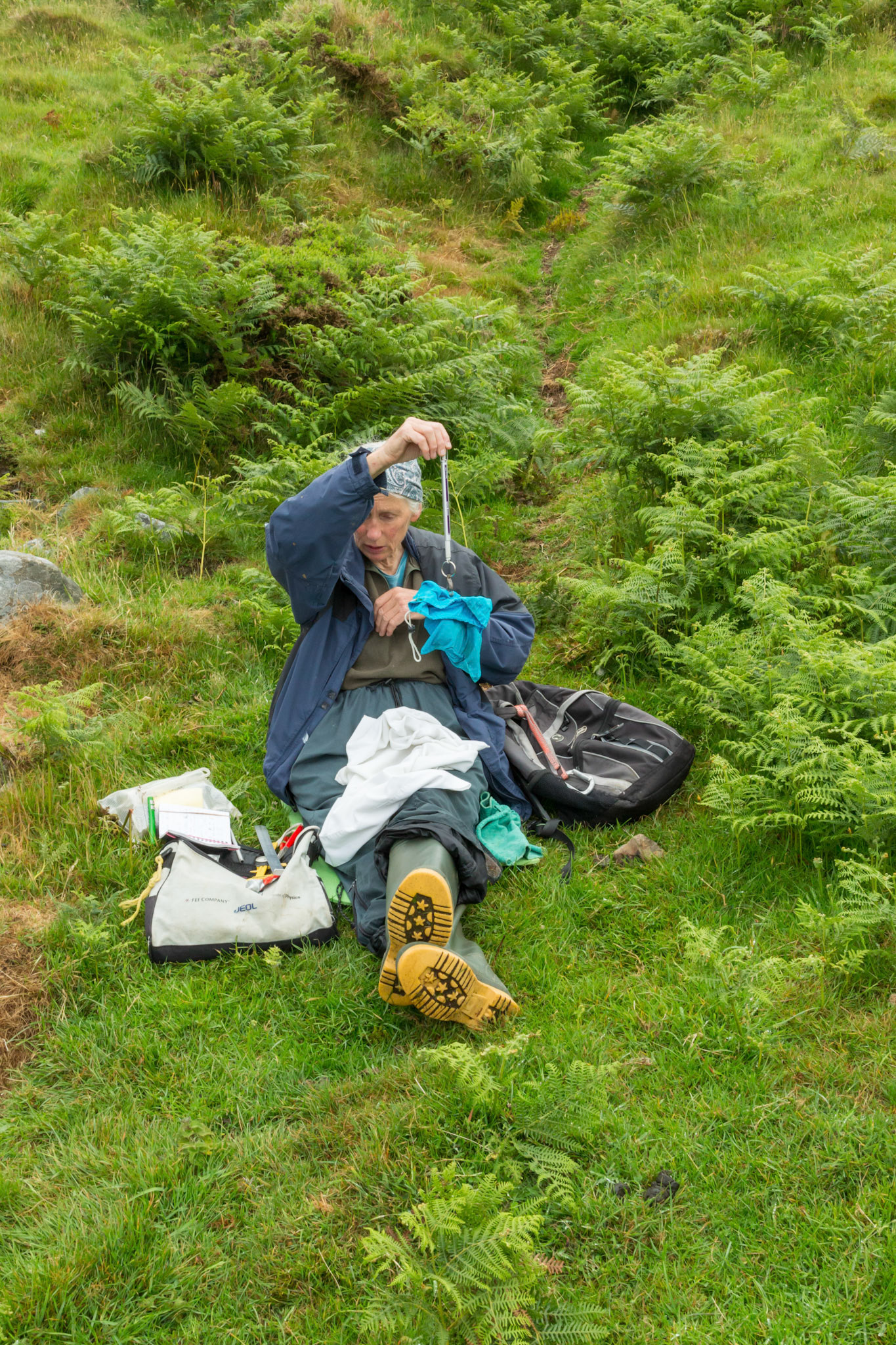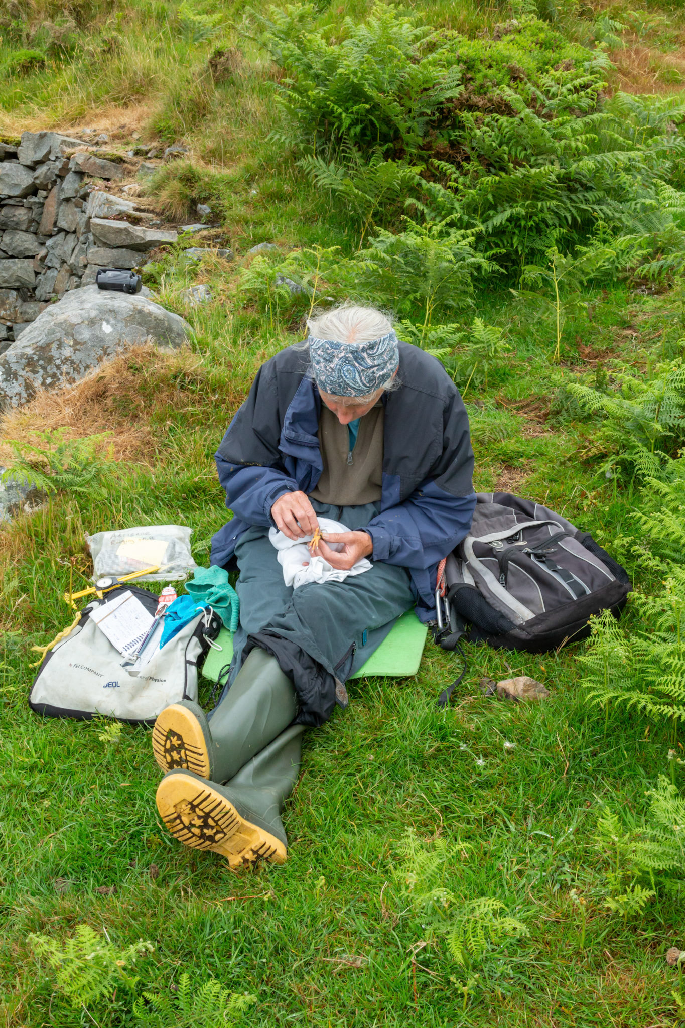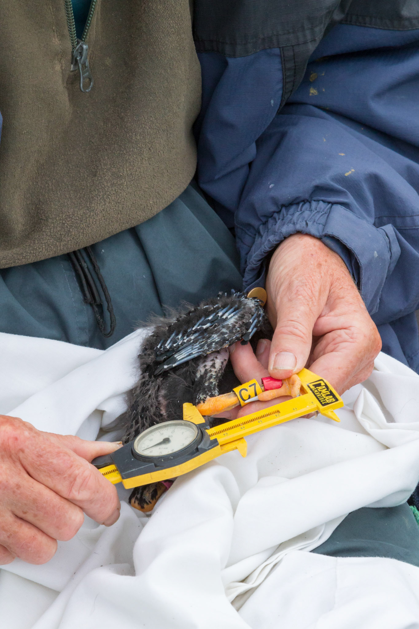 Chough, Pyrrhocorax pyrrhocorax, with rings, feeding on cliff. Summer, South Stack, Anglesey, Wales, UK